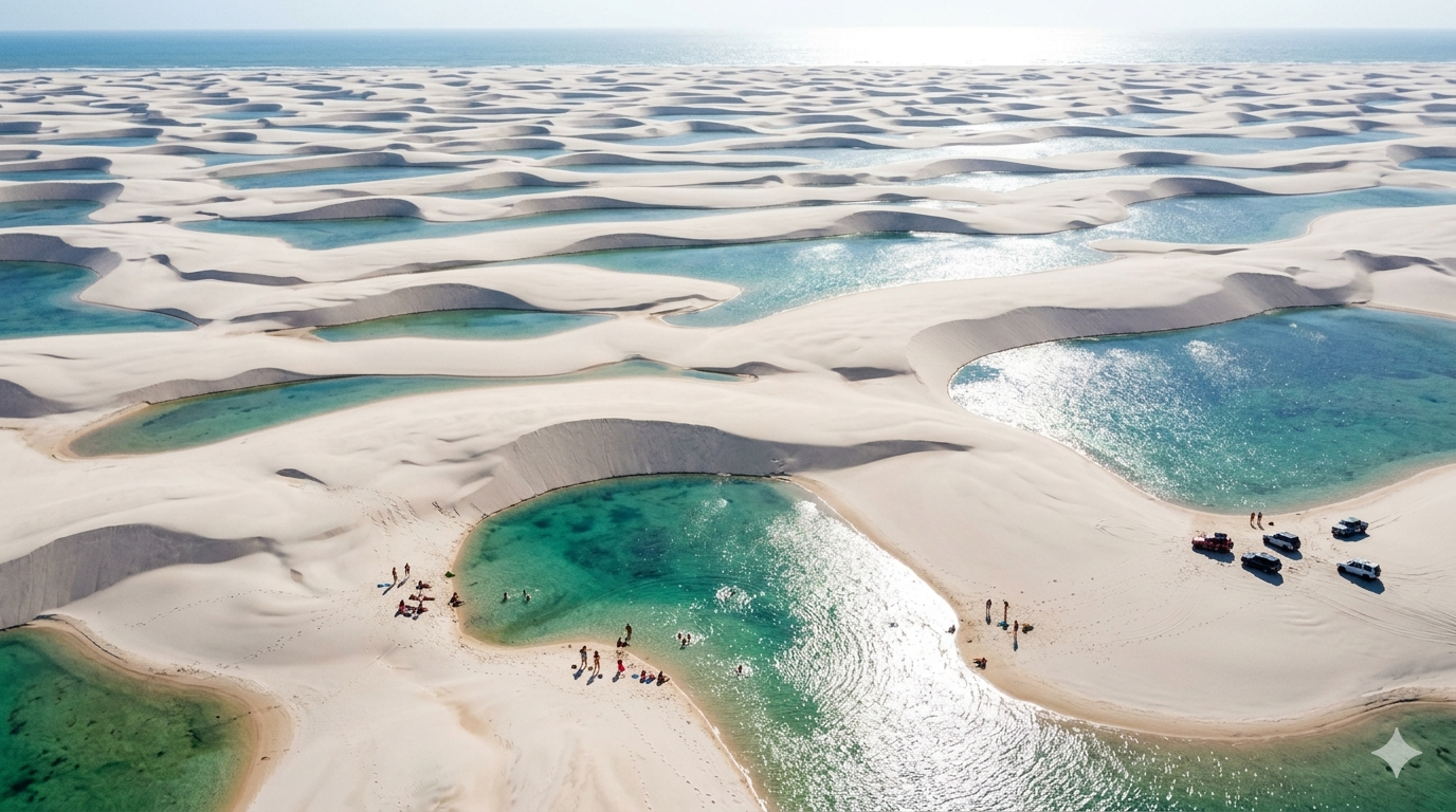 👉 lagoas de água cristalina se formam entre as dunas. O contraste entre a areia branca e a água azul cria uma paisagem única no mundo.